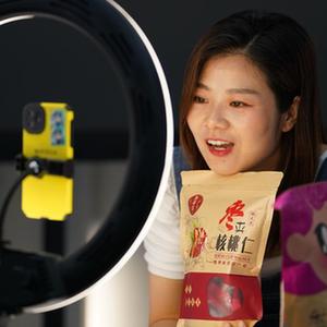 5月12日,残疾人网络主播渭梅女在西安一家直播产业基地直播带货。