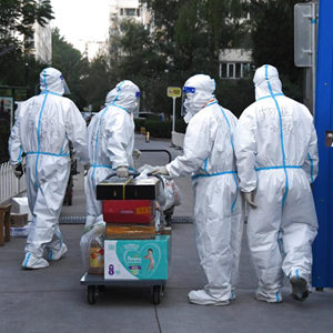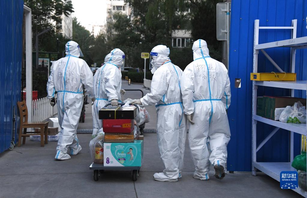 为保障小区居民生活,中关村街道组织工作人员统计小区居民需求,为居民提供运送生活物资等服务。新华社记者 任超 摄
