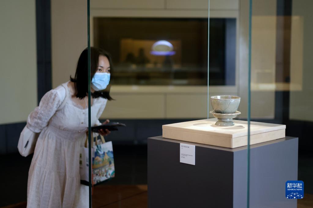 5月15日,游客在苏州博物馆观看秘色瓷莲花碗。