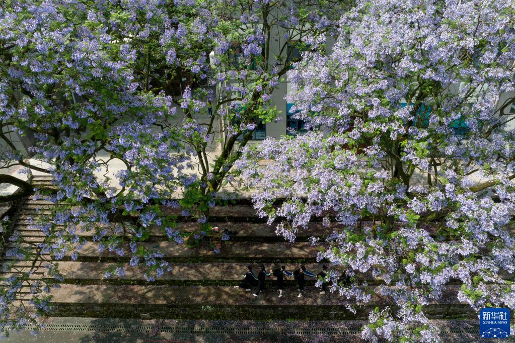 近日,位于重庆市北碚区的西南大学校园内的蓝花楹相继开花,毕业班的学生纷纷来此拍摄个性毕业照,留下校园美好回忆。