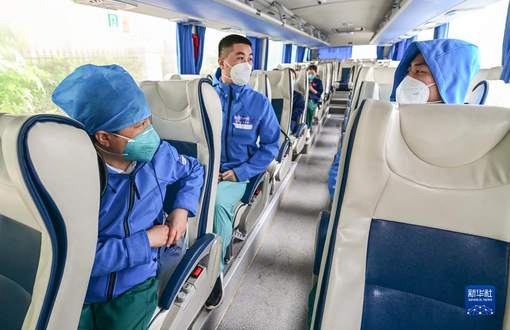 胡鹰鹰(左)在由同济大学附属上海第四人民医院返回住地的大巴车上向刚下夜班的队员问询院感防控情况(5月13日摄)。