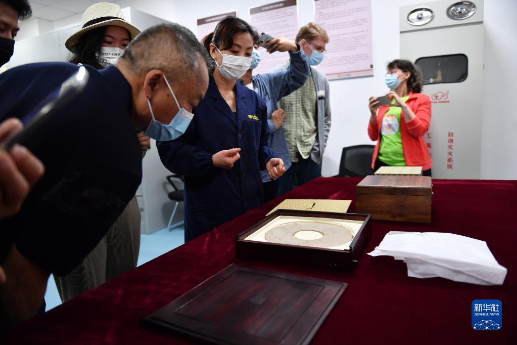 5月17日,长沙博物馆玉石器库工作人员(中)向参观者展示储藏文物的囊匣。