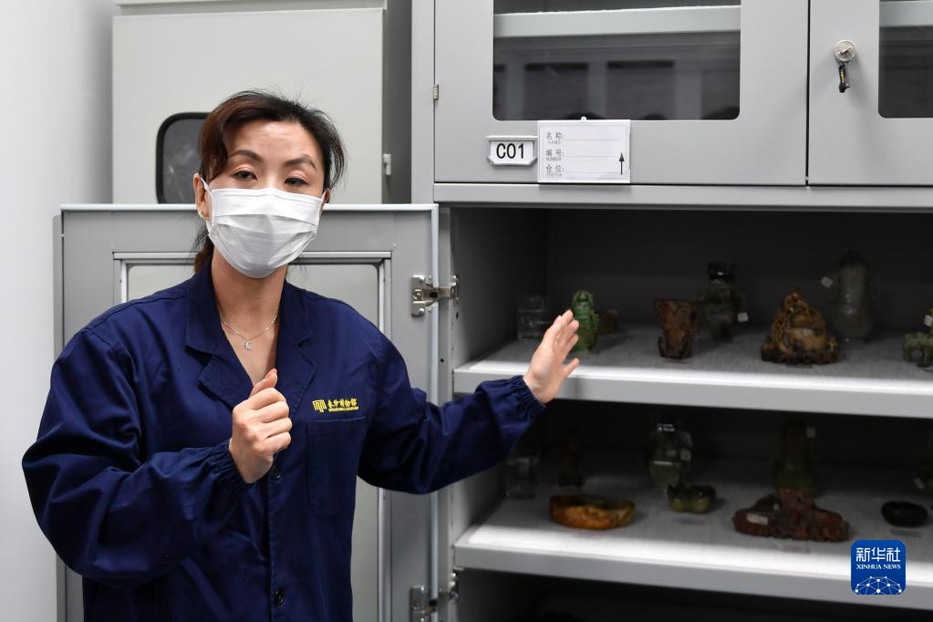 5月17日,长沙博物馆玉石器库工作人员在介绍文物储藏情况。