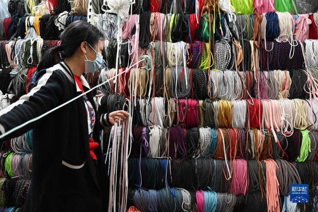 5月16日,在福建省晋江国际鞋纺城,一家鞋带织造企业的销售人员在挑选鞋带。