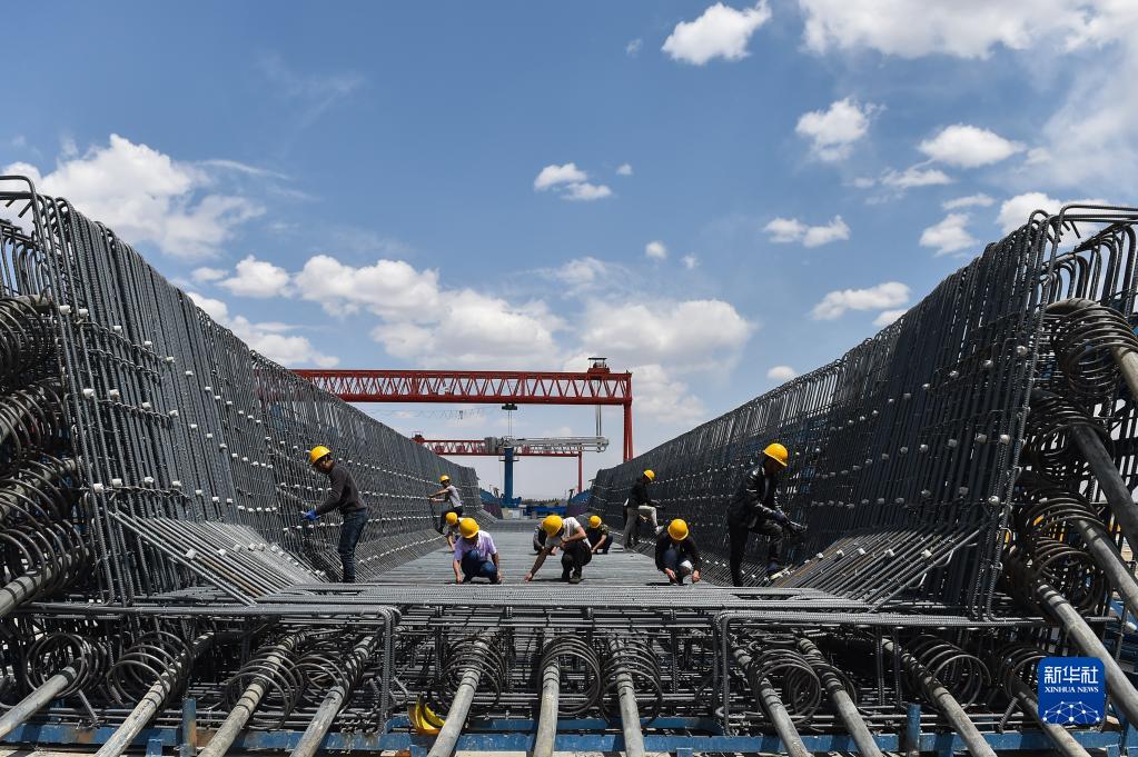 5月17日,在内蒙古乌兰察布市察哈尔右翼前旗,中铁十九局工人在制梁场忙碌。