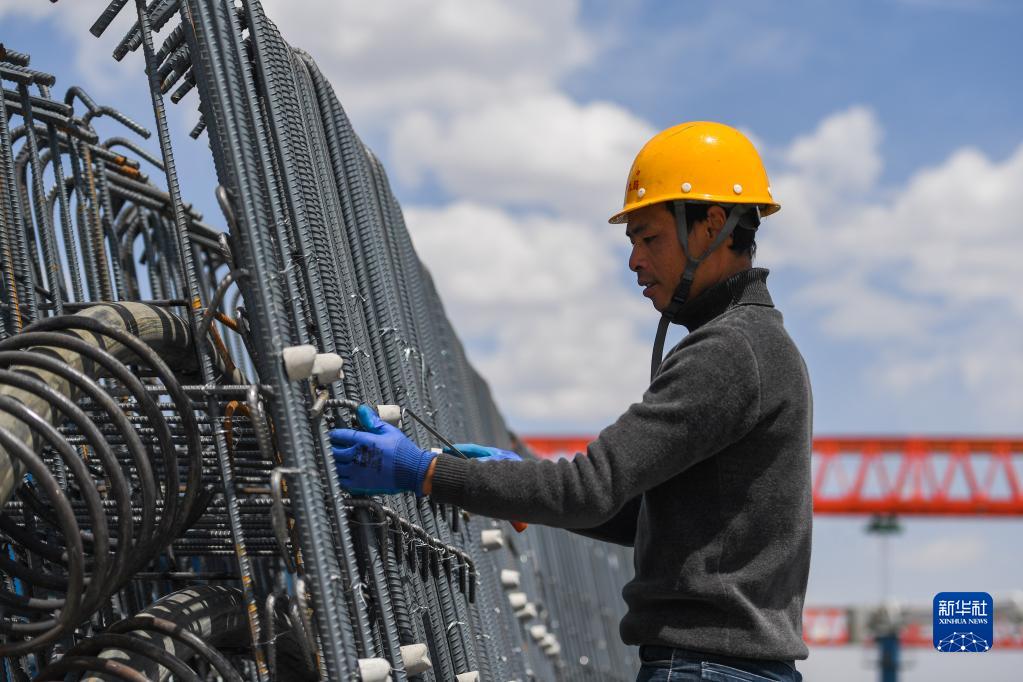5月17日,在内蒙古乌兰察布市察哈尔右翼前旗,中铁十九局工人在制梁场忙碌。