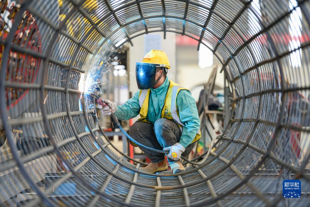 5月17日,建设者在包银高铁跨海勒太斯沟特大桥首根桩基施工现场进行焊接作业。