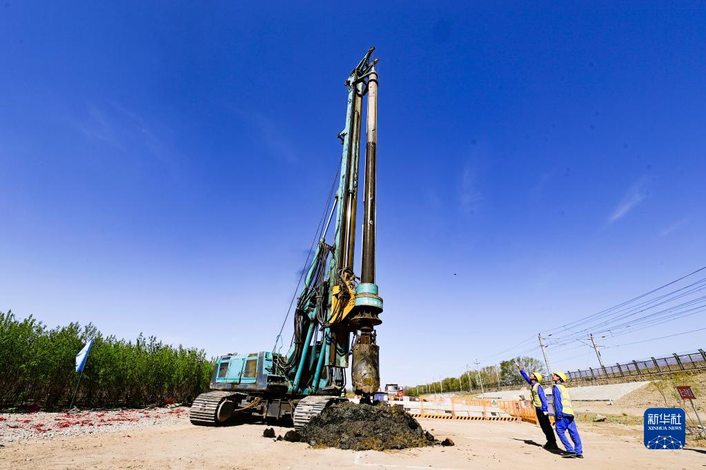 5月17日,建设者在包银高铁跨海勒太斯沟特大桥首根桩基施工现场作业。
