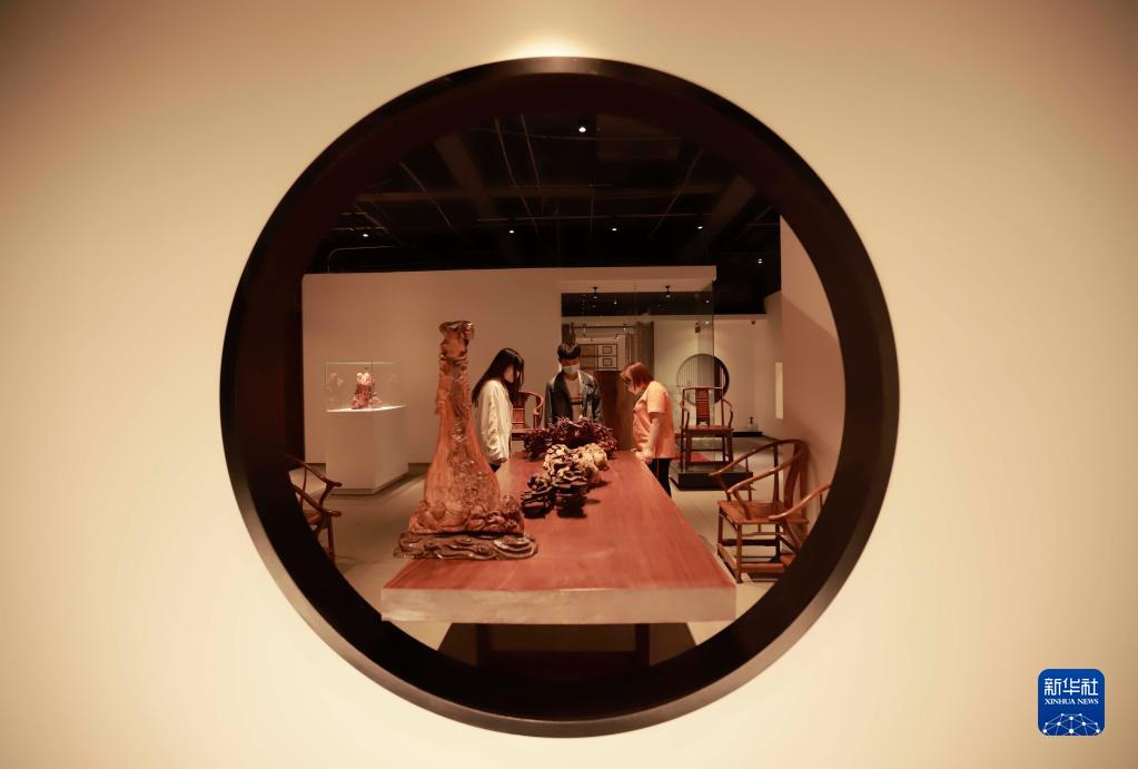 5月17日,人们在位于河北省遵化市新店子镇的一家木雕艺术博物馆观看藏品。