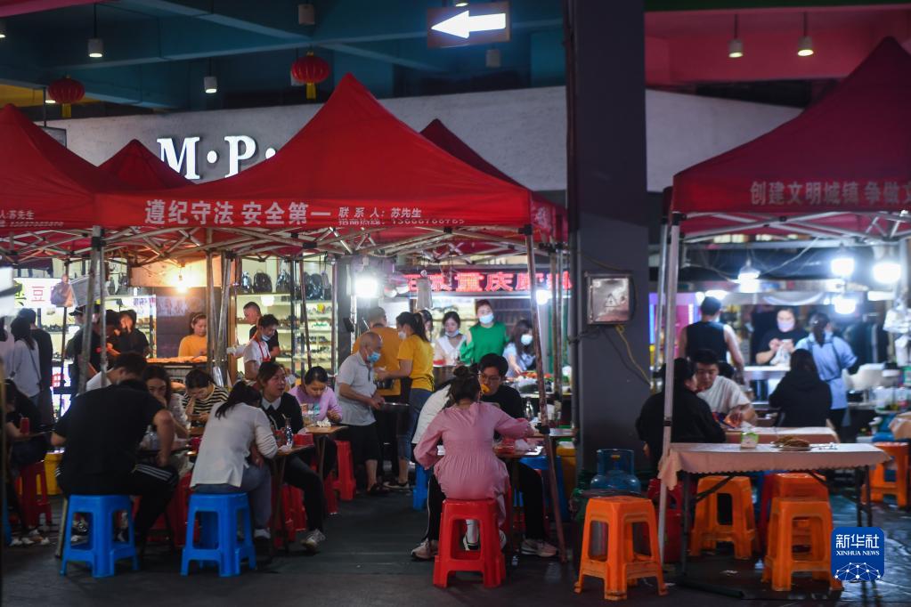 近日,浙江省桐乡市濮院镇佳源夜市逐渐恢复了往日的热闹景象。该夜市有200多个摊位,有夜宴、夜娱、夜购、夜游、夜拍为特色的活动,是集吃、喝、玩、乐、购于一体的一站式消费中心。
