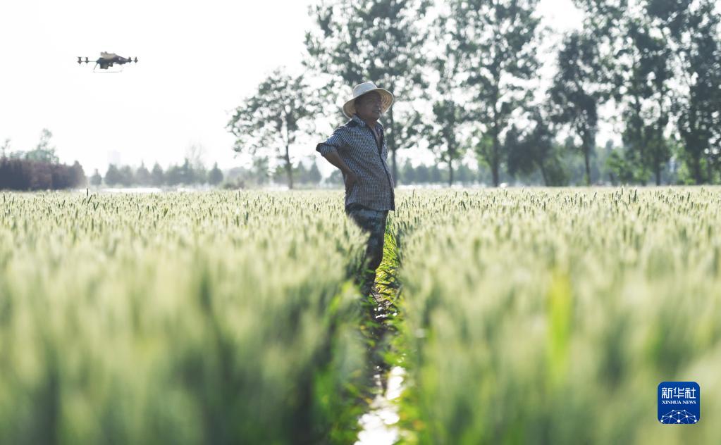 5月17日,新乡市延津县僧固乡李庄村村民在自家麦田查看浇水进度。