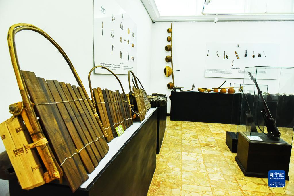 这是5月15日在喀麦隆首都雅温得国家博物馆内拍摄的传统乐器展厅。