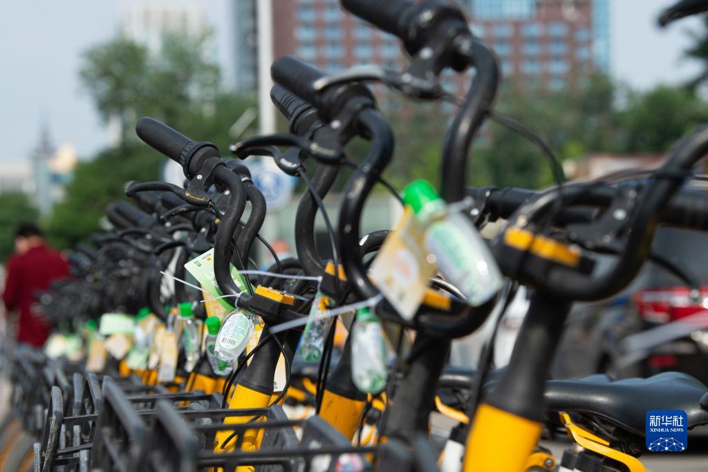 近日,共享单车运营方加强对北京市内共享单车的消毒措施,部分点位的共享单车配备消毒洗手液,以保障市民在疫情期间的骑行安全。