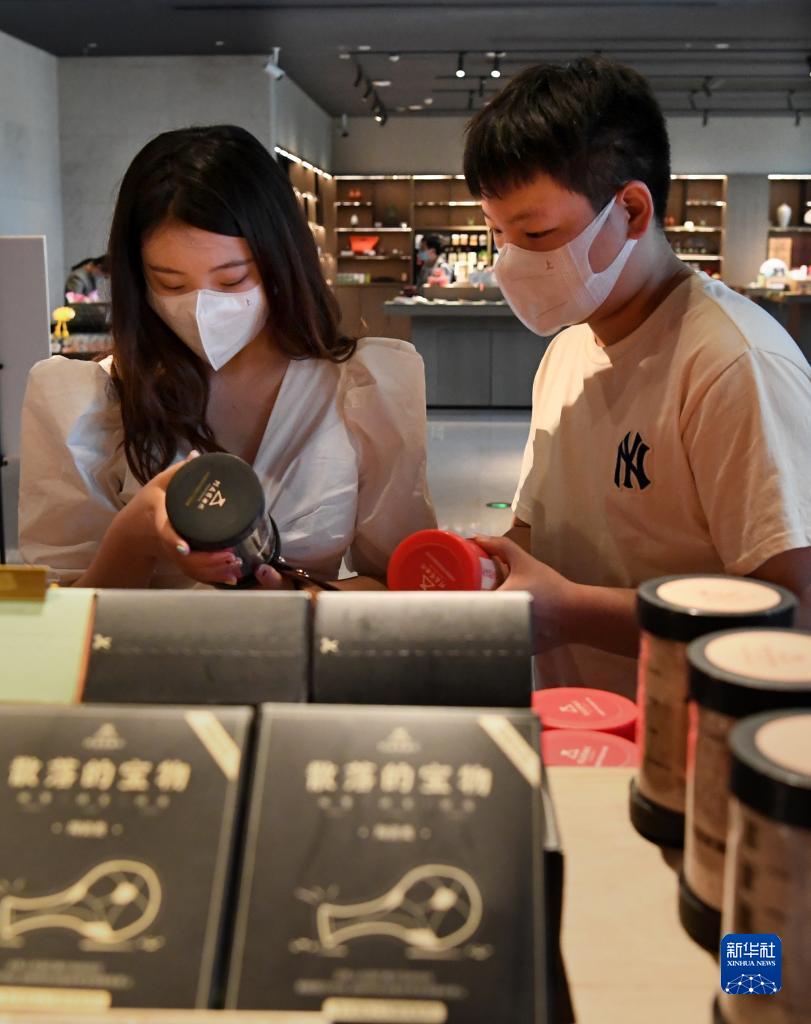 5月17日,两位参观者在河南博物院文创商店内挑选考古盲盒。