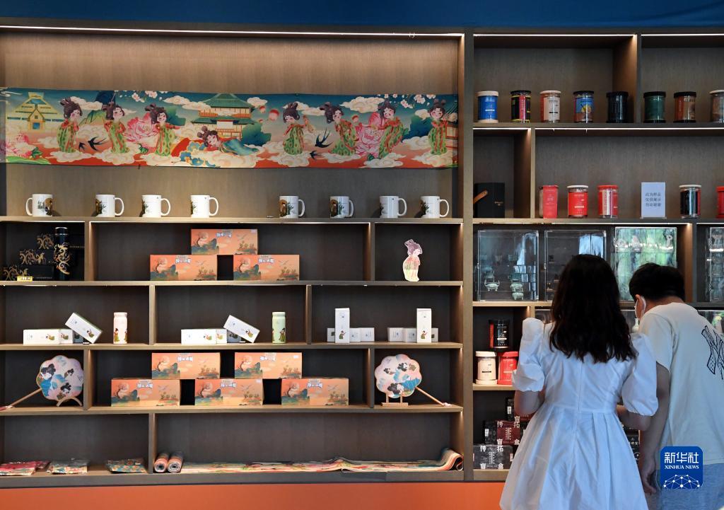 5月17日,两位参观者在河南博物院文创商店内挑选文创产品。