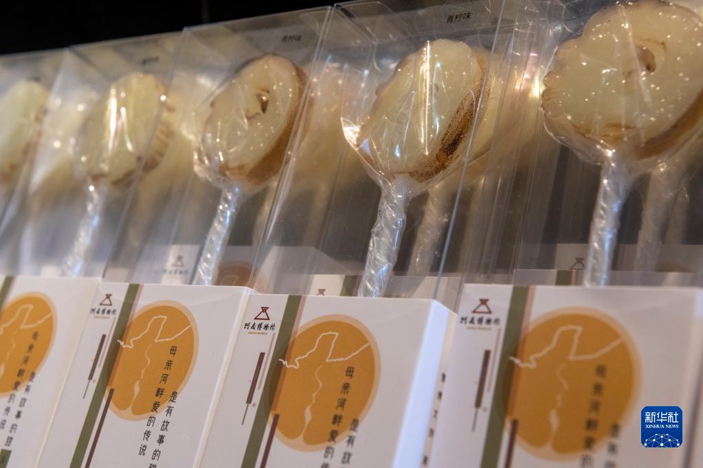 这是在河南博物院文创商店拍摄的以“青玉人首蛇身饰”为原型的玉佩棒棒糖(5月17日摄)。