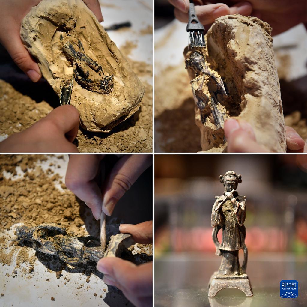 这是河南博物院推出的考古盲盒的“挖宝”过程(拼版照片,5月17日摄)。