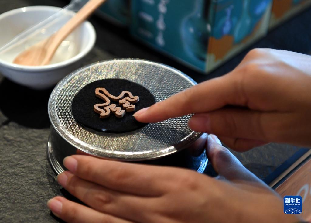 5月17日,工作人员在河南博物院文创商店内讲解制香盲盒的制作方法。