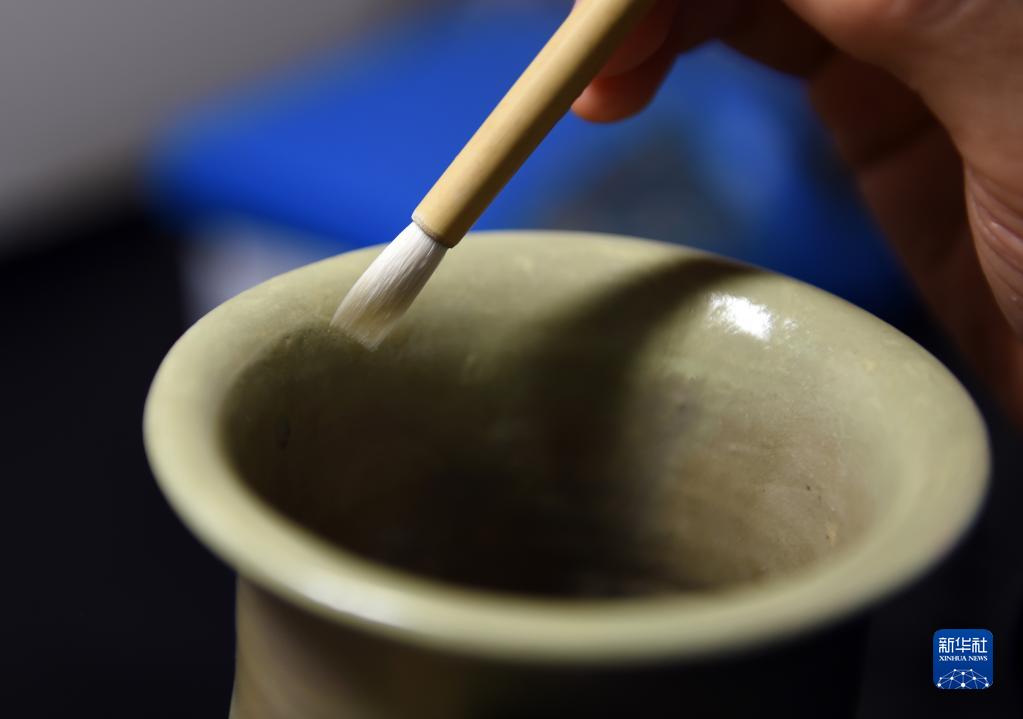5月17日,在安徽博物院文物科技保护中心陶瓷器保护修复室,工作人员对瓷器文物进行作色。