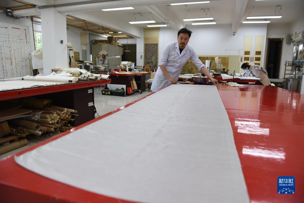 5月17日,在安徽博物院文物科技保护中心纸质文物修复室,工作人员进行书画装裱的“拖绫”步骤。