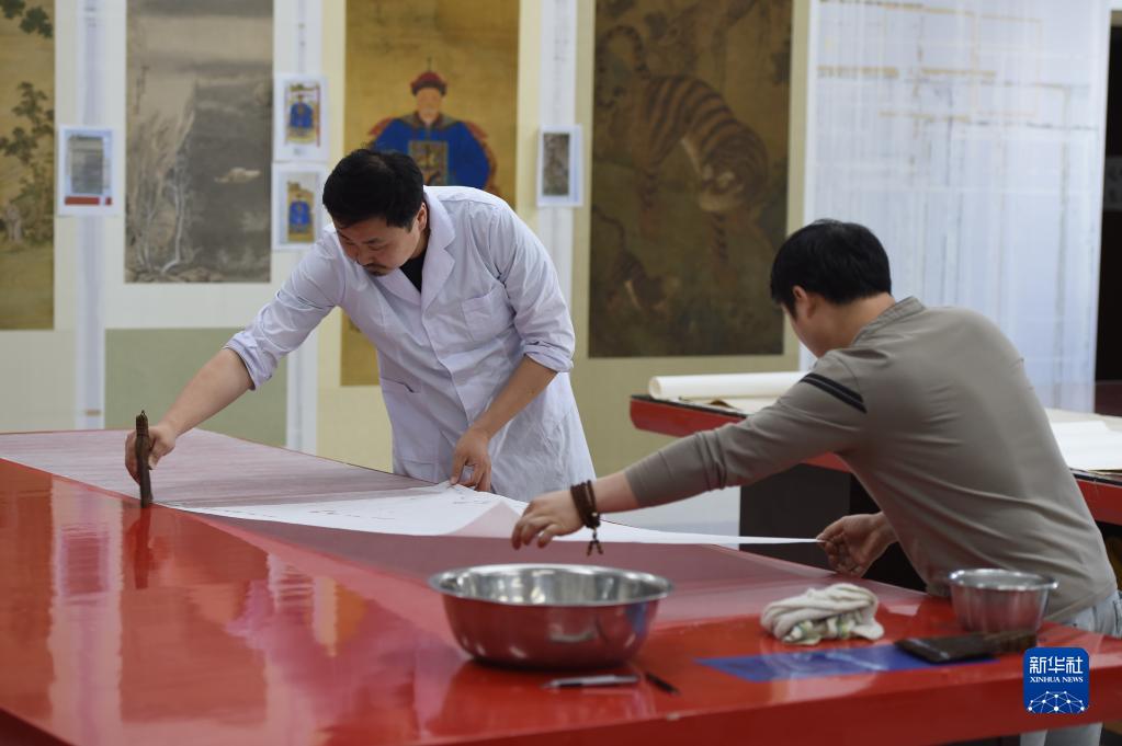 5月17日,在安徽博物院文物科技保护中心纸质文物修复室,工作人员进行书画装裱的“拖绫”操作。