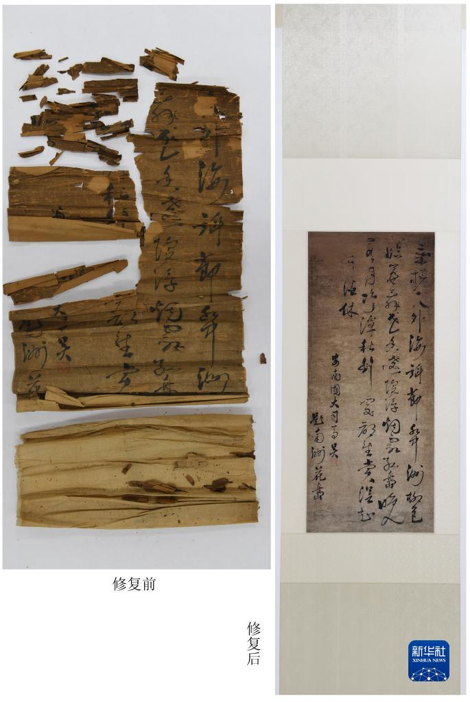 经安徽博物院文物科技保护中心修复的清代安南大司马行书条修复前后对比图。