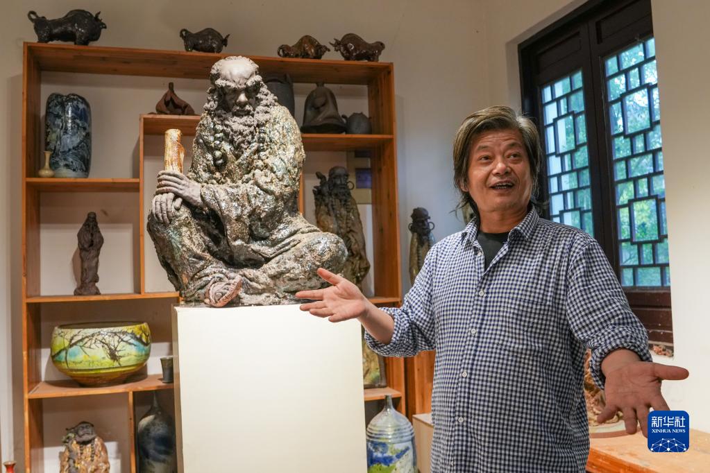 在位于南京高淳的江苏省文艺家创作基地,省级陶瓷艺术大师童定家在工作室内介绍自己的陶艺作品(4月25日摄)。