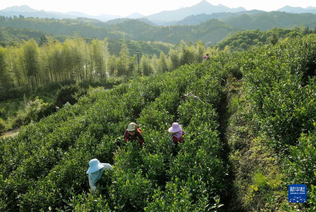 5月17日,茶农在政和县镇前镇罗金山生态茶园采摘二春白茶茶青(无人机照片)。