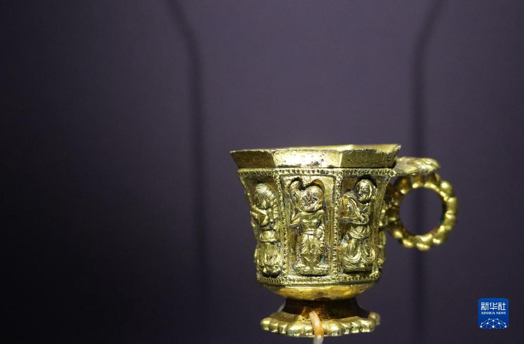 这是在陕西历史博物馆“大唐遗宝——何家村窖藏出土文物展”上拍摄的鎏金伎乐纹八棱杯(5月18日摄)。