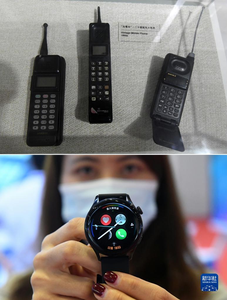 拼版照片:上图是广西民族博物馆展出的二十世纪九十年代使用的移动电话(5月18日摄);下图是在广西南宁国际会展中心展示的具备通话功能的智能手表(2021年9月12日摄)。