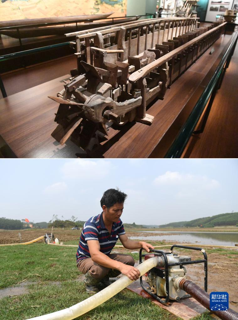 拼版照片:上图是广西民族博物馆展出的灌溉用龙骨车(5月18日摄);下图是在广西钦州市钦南区东场镇上寮村,当地村民用抽水机灌溉农田(2021年3月13日摄)。