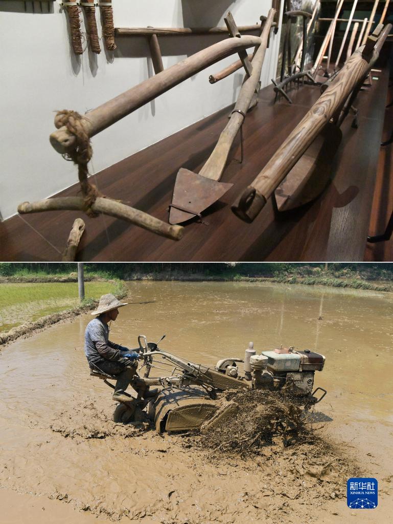 拼版照片:上图是广西民族博物馆展出的犁(5月18日摄);下图是在广西来宾市兴宾区三五镇古炼村,当地村民用机器犁田(2021年7月24日摄)。