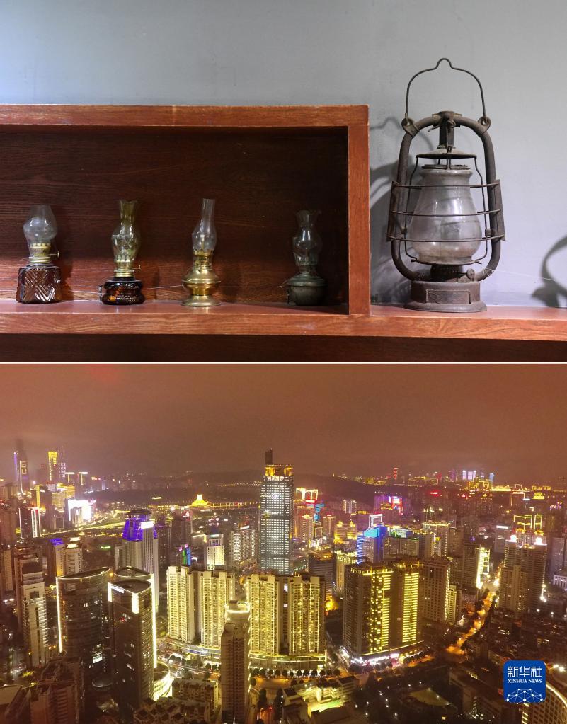 拼版照片:上图是广西民族博物馆展出的照明器具(5月18日摄);下图是广西南宁市的璀璨夜色(2018年12月10日摄,无人机照片)。