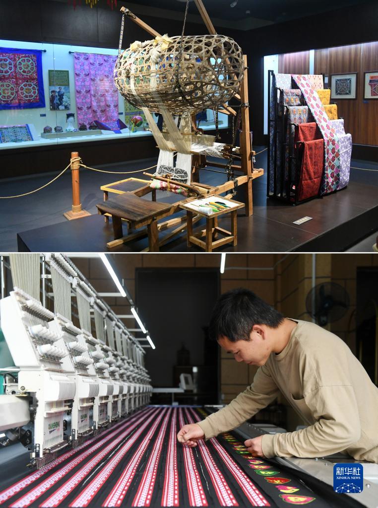 拼版照片:上图是广西民族博物馆展出的手工织锦机(5月18日摄);下图是在广西贺州市八步区,一名工人用机械织锦(3月13日摄)。