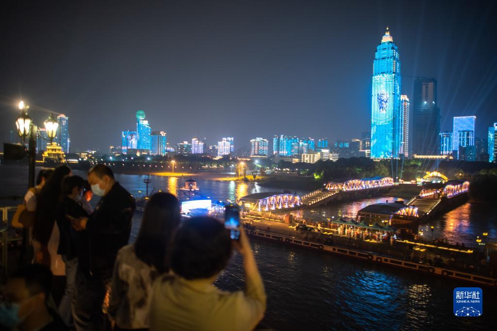 5月18日是国际博物馆日。当晚,湖北武汉上演“博物馆之夜”主题长江灯光展示活动。活动融合现代光影、AR等技术,动态展示各地精美馆藏文物及主题标语,点亮两江四岸标志性建筑,让文物“活”起来。新华社记者 肖艺九 摄
