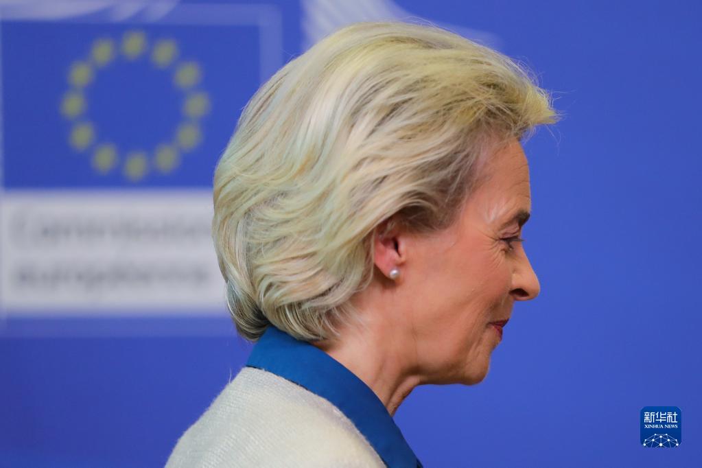 5月18日,欧盟委员会主席冯德莱恩在比利时布鲁塞尔的欧盟委员会总部发言后离开。