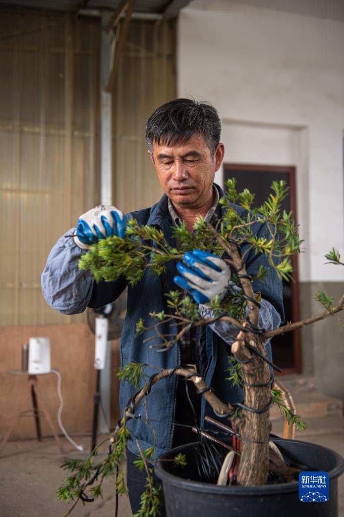 5月19日,虹星村村民芦纪生用铝丝为盆景做造型。