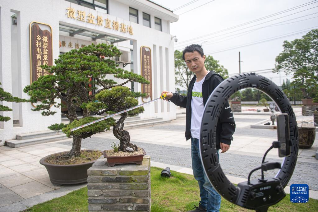 5月19日,虹星村村民严嘉盛在盆景直播基地直播销售盆景。