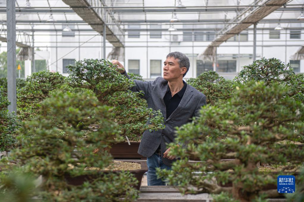 5月19日,虹星村盆景直播基地负责人苏伟江在大棚内修剪盆景植物。
