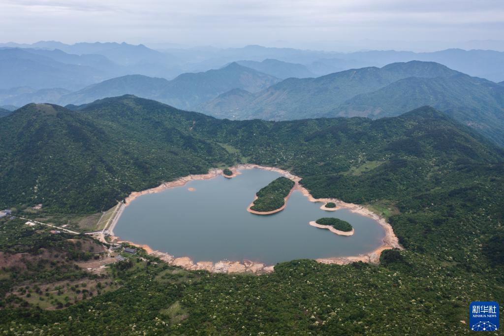 空中俯瞰浙江清凉峰国家级自然保护区的千顷塘水库(5月19日摄,无人机照片)。