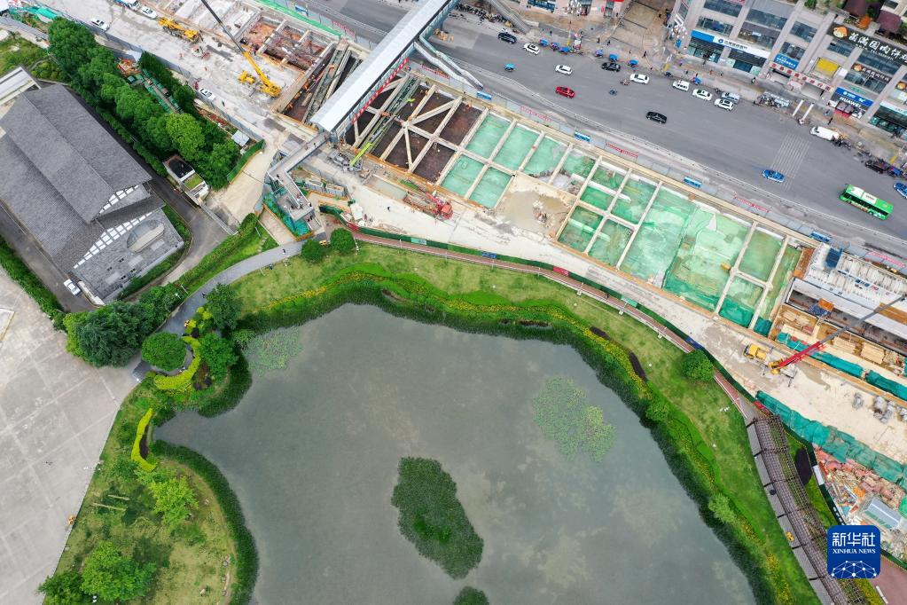 5月19日,工作人员在贵阳轨道交通三号线花果园东站施工(无人机照片)。