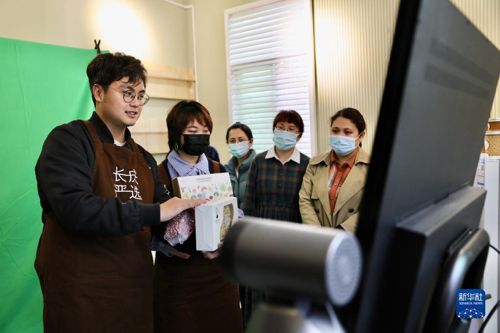 5月16日,在福建省福州市永泰县长庆镇农技站直播室,台湾青年詹竣杰(左)在向长庆镇干部及青年演示直播带货。