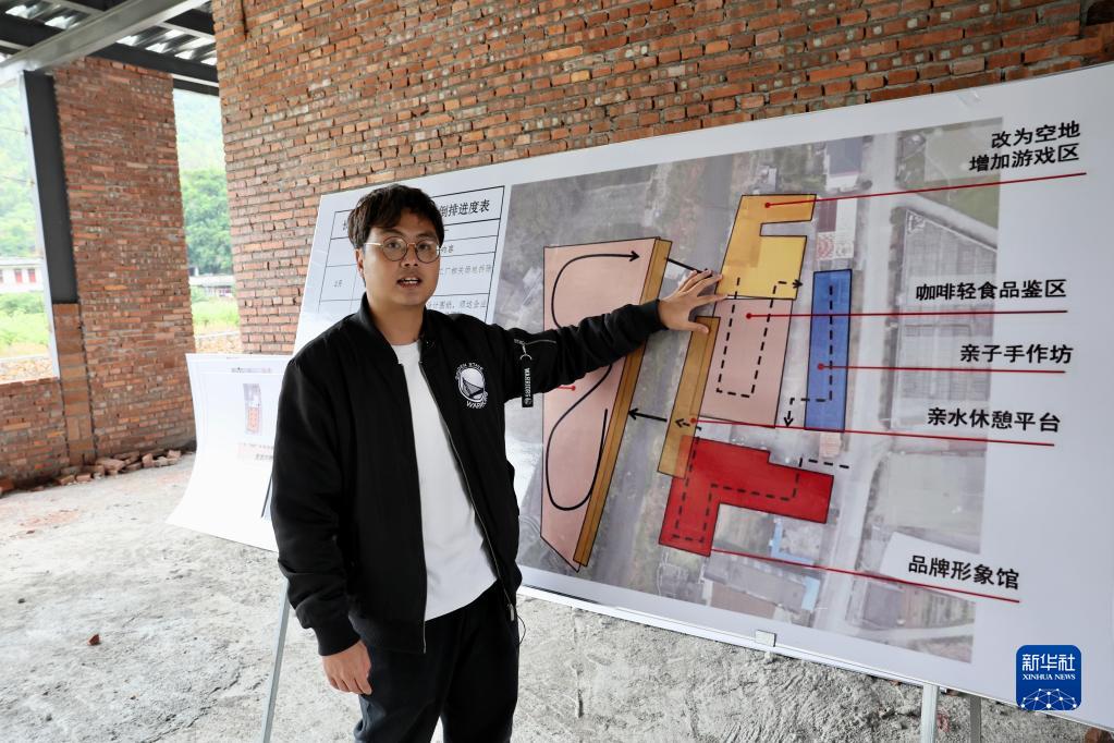 5月16日,在建设中的“李果观光工厂”项目现场,台湾青年詹竣杰介绍设计思路。