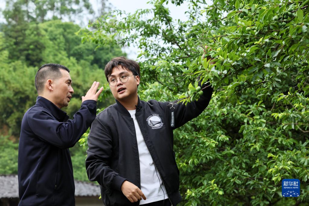 5月16日,台湾青年詹竣杰(右)在福建省福州市永泰县长庆镇中埔村了解李果种植情况。