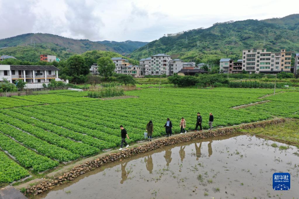 5月16日,台湾青年詹竣杰(右二)在福建省福州市永泰县长庆镇中洋村参观花生田(无人机照片)。