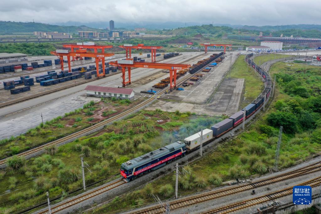 5月19日,首列成渝地区双城经济圈货运班列(重庆江津-成都青白江)在重庆江津小南垭铁路物流中心顺利发车(无人机照片)。