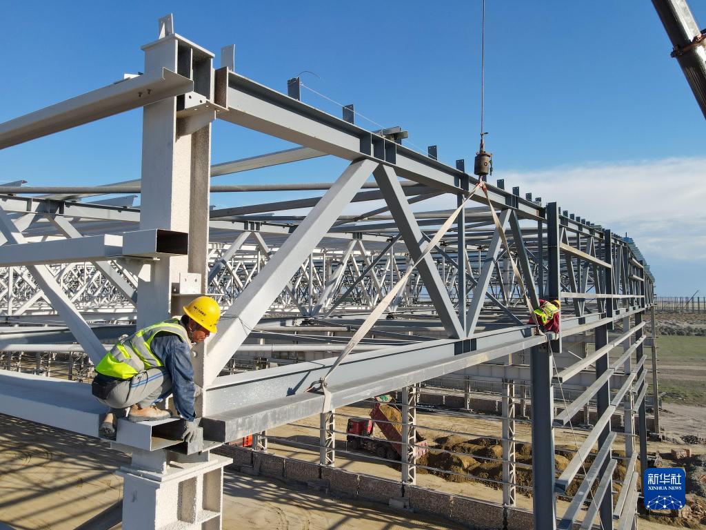 工人在20余米高的新疆塔城重点开发开放试验区一处风机叶片制造项目顶部进行屋面檩条安装作业(5月18日无人机拍摄)。