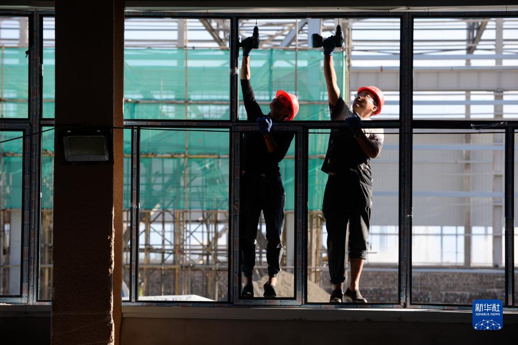 新疆塔城重点开发开放试验区风机叶片制造项目内,工人在安装门窗(5月18日摄)。