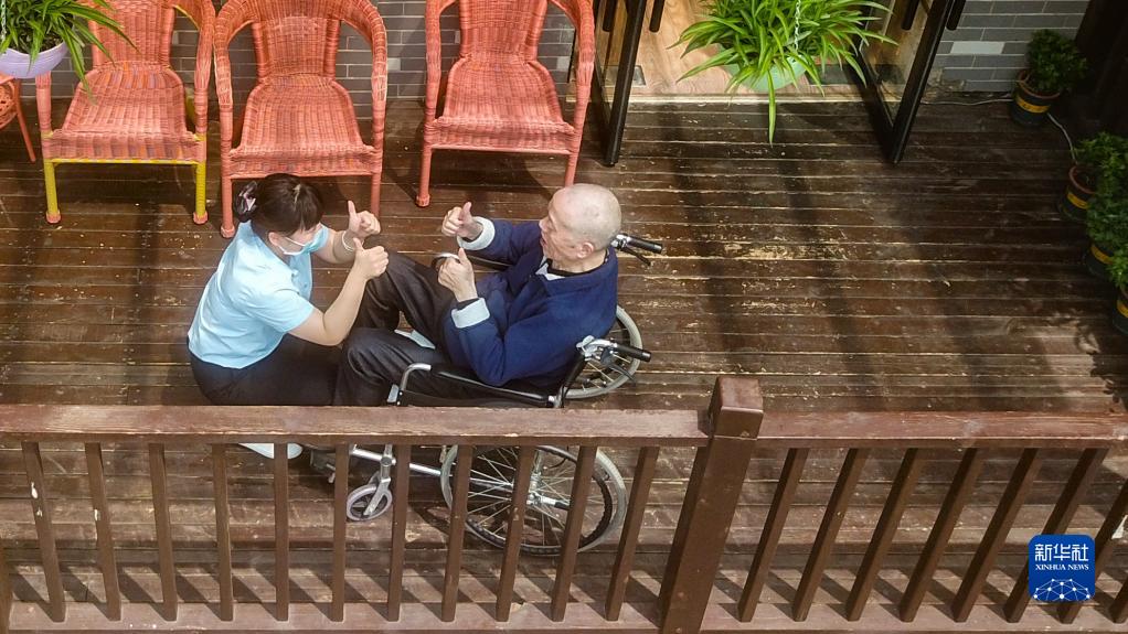 在湘潭市雨湖区窑湾街道综合养老服务中心,刘梦帮助老人进行腿部的康复训练时对老人进行鼓励(5月17日摄,无人机照片)。