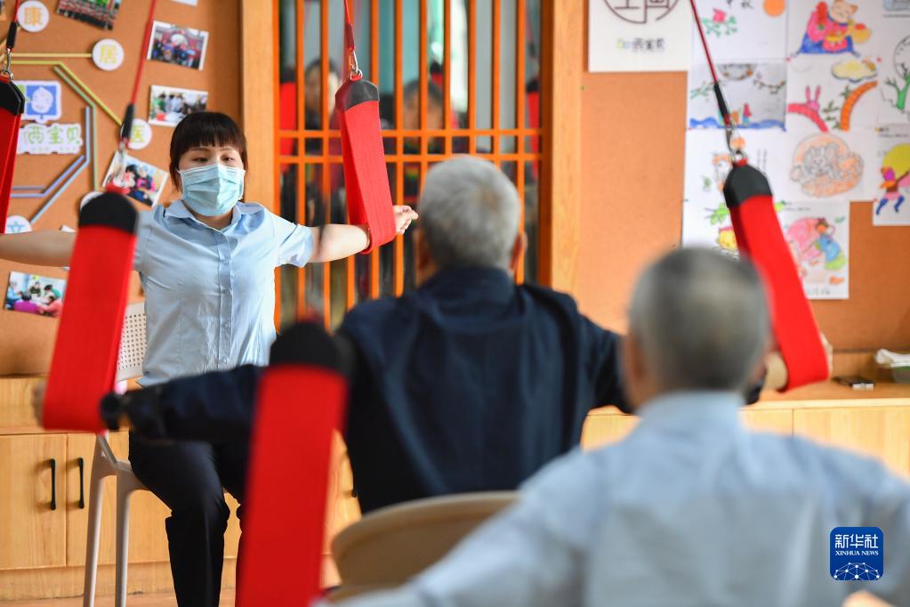 在湘潭市雨湖区窑湾街道综合养老服务中心,刘梦带着老人进行康复训练(5月17日摄)。